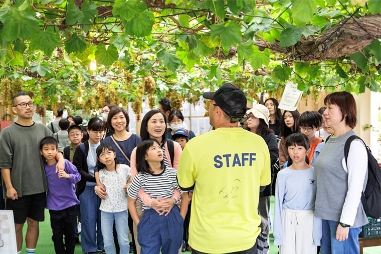 次に向かったのは白根グレープガーデン。イチゴやブドウ、リンゴやキウイ、ル・レクチエなど一年中、果物の収穫体験ができる場所です。旬のブドウの収穫を前に、グレープガーデンの笠原さんから説明を聞きました。「白根は細長い唐辛子のような形をしています。川に囲まれていて、果樹園のすぐそばにも信濃川が流れています。白根といえば果物。どうして栽培が盛んになったか知っていますか?」