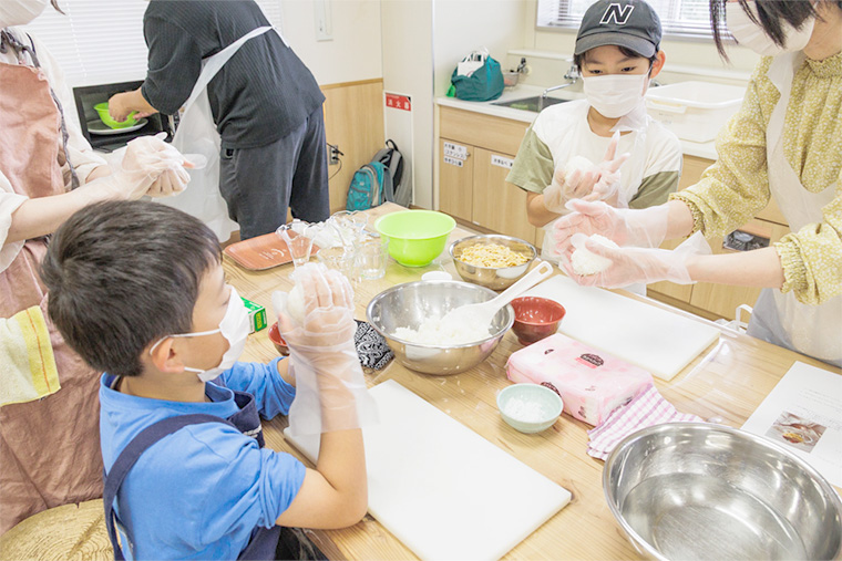 「おにぎりは『おいしくなーれ』と気持ちを込めながら握ってみてください。手で握って作る、それをいただくのは信頼の証です」と佐藤さん。子どもたちは三角おにぎりを作るコツも教えてもらったが、難しかったようで、まん丸ボールのおにぎりが並びました。