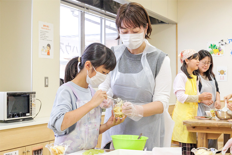 電子レンジで作るカスタードクリームにも挑戦。保護者らには「簡単。ダマにもならなくていいですね」「家でも子どもとやってみたいです」と好評でした。
