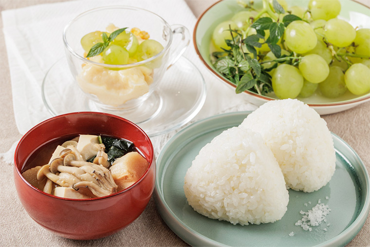 ブドウのパフェと新米のおにぎり